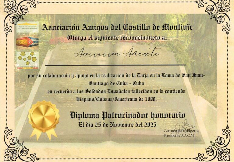 La Asociación de Amigos del Castillo de Montjuïc, nos remite el Diploma de Reconocimiento por la colaboración prestada por nuestra Asociación para llevar a buen puerto la iniciativa de realizar